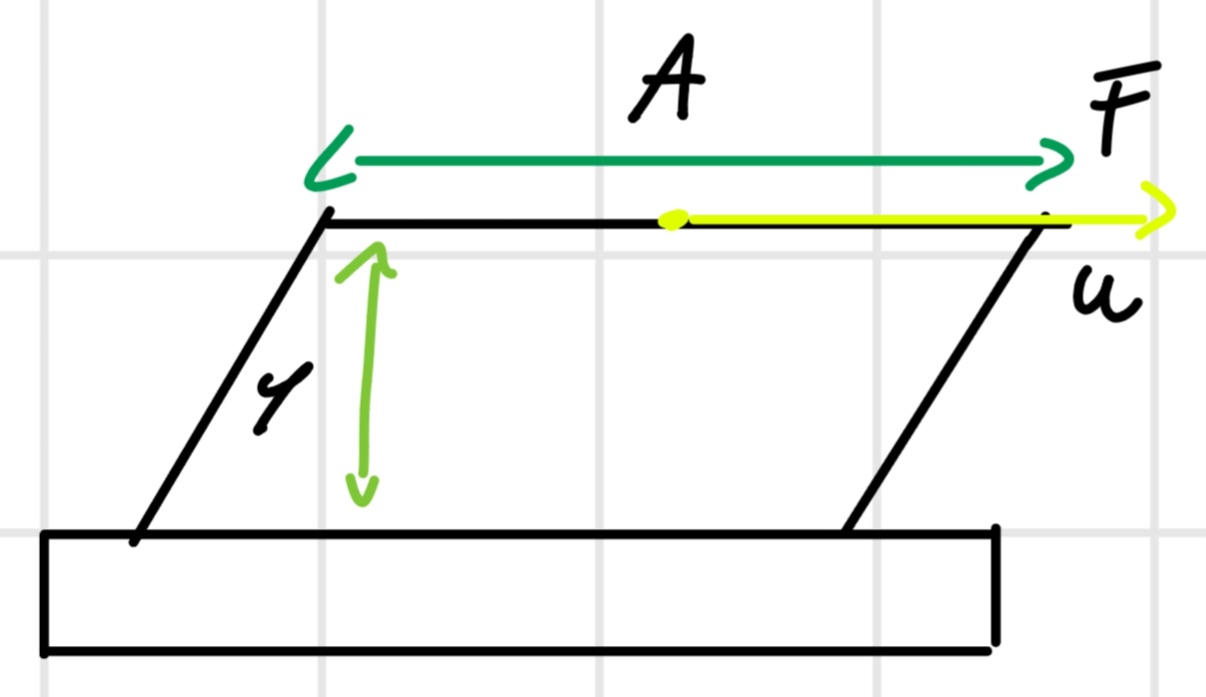- F: force applied to win the resistance and to maintain a constant velocity u of top plate (Area A)