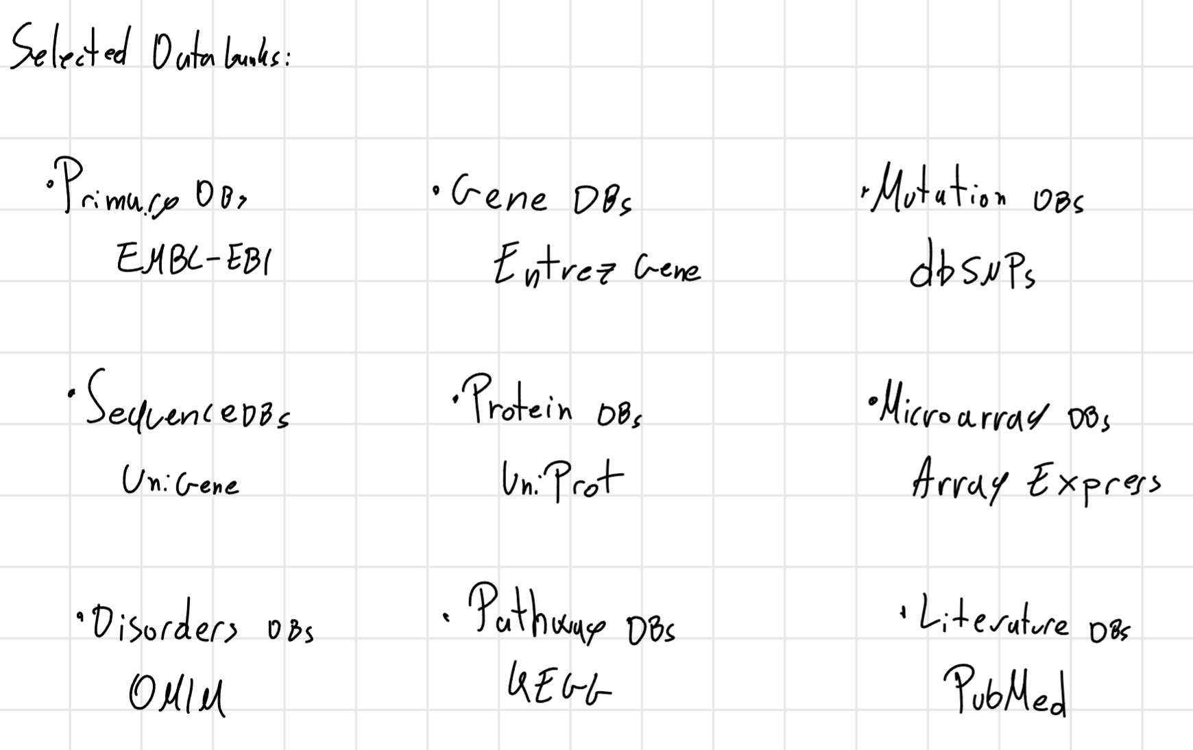 - Primary databank (DNA/RNA/Proteins,…) \to contain only generic information