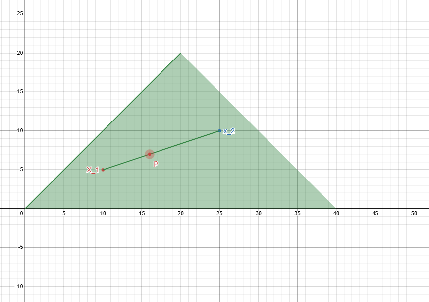 A subset S \subseteq R^n is convex if for each pair of points \underline{x}_1,\underline{x}_2 \in S the segment defined by them is the defined by all the convex combinations of the two points: [\underline{x}_1,\underline{x}_2] = {\:\underline{p} \in R^n : \underline{x} = \alpha\underline{x}_1 + (1 - \alpha)\underline{x}_2 \, \land \alpha \in [0,1]\:}